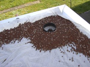 - Das Filtervlies auf der Festkörperdränage straff ausbreiten. Bei mehreren Vliesstücken sollte die Überlappung etwa 10 cm betragen.